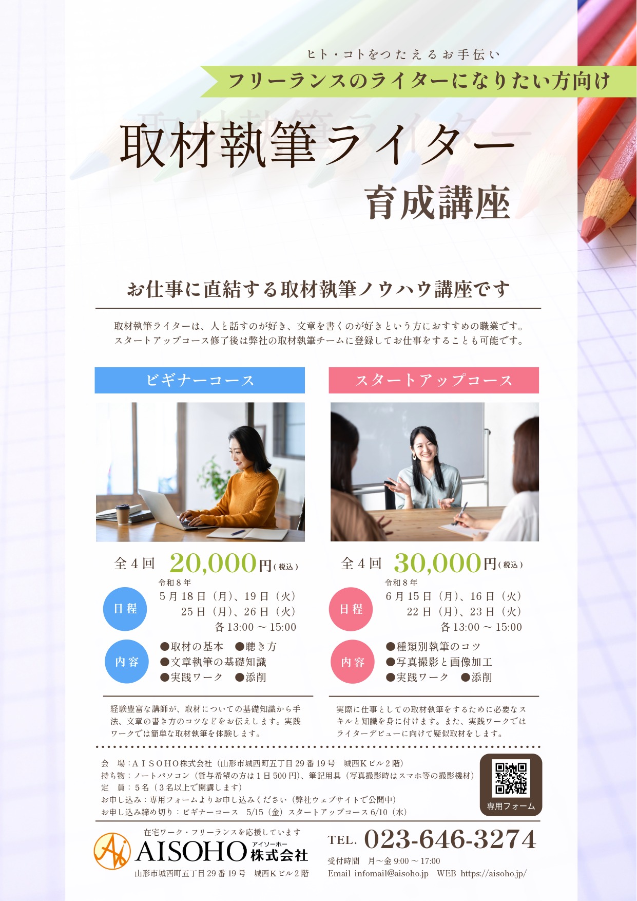取材執筆ライターは、人と話すのが好き、文章を書くのが好きという方におすすめの職業です。 スタートアップコース修了後は弊社の取材執筆チームに登録してお仕事をすることも可能です。